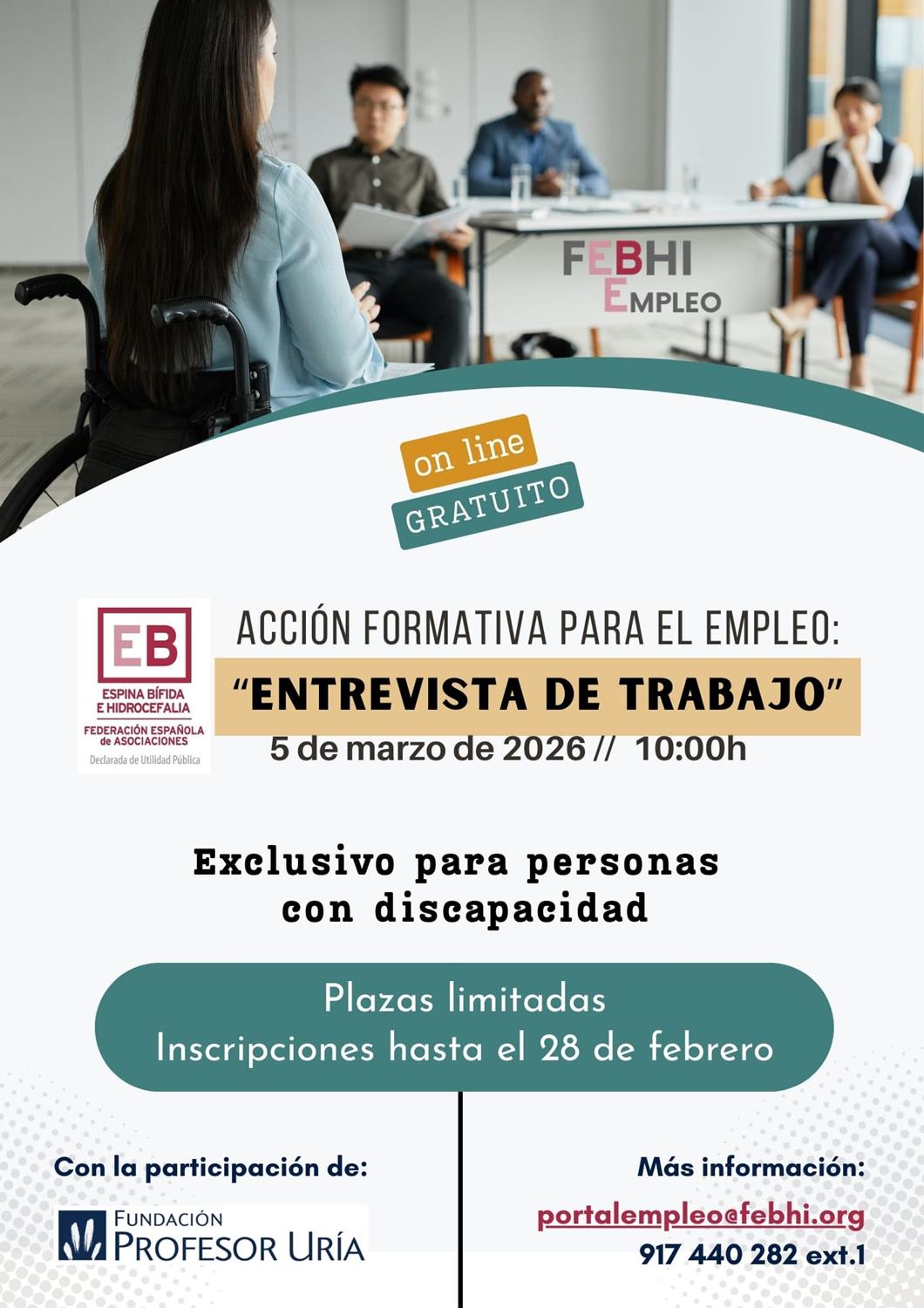 Acción formativa ONLINE y GRATUITA, exclusiva para personas con discapacidad. La ponente pertenece a Uría Menéndez Abogados. Se abordarán los siguientes temas: - La huella digital - Primeras cribas - La importancia del descanso - La primera impresión - Preguntas que suelen hacer y frases a evitar - Al llegar a casa - Claves del éxito