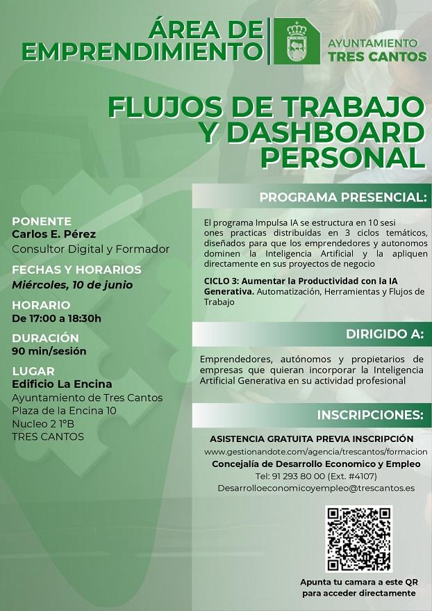 El programa Impulsa IA se estructura en 10 sesiones prácticas distribuidos en 3 ciclos temáticos, diseñados para que los emprendedores y autónomos dominen la Inteligencia Artificial y la apliquen directamente en sus proyectos de negocio. Esta jornada corresponde al CICLO 3: AUMENTAR LA PRODUCTIVIDAD CON LA IA GENERATIVA. AUTOMATIZACIÓN, HERRAMIENTAS Y FLUJOS DE TRABAJO.
